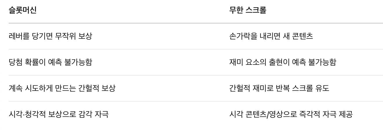 실제로 소셜 미디어의 피드 구조는 슬롯머신과 동일한 확률형 UX 구조를 기반으로 한다.